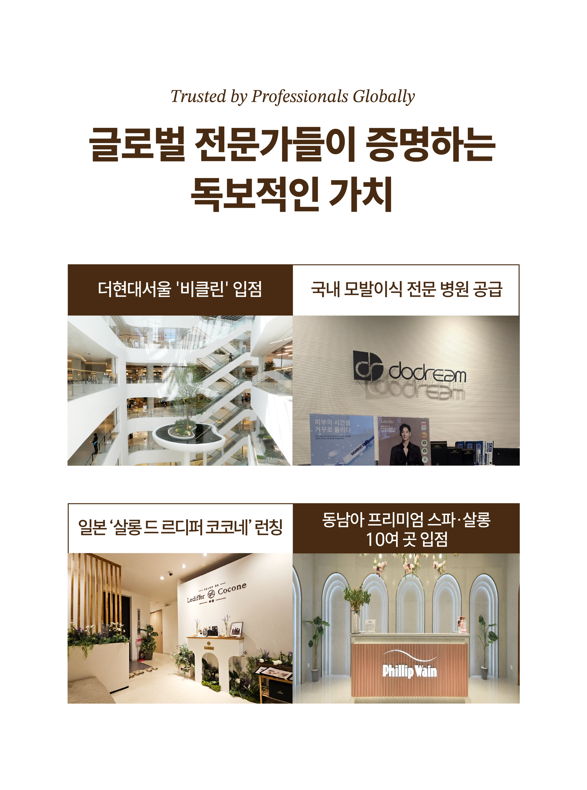 - 모발 수분 손실을 방지하는 모로코산 아르간오일, 풍부한 비타민으로 영양을 공급하는 로즈힙 오 일 항산화 효과가 우수한 동백나무씨오일, 지성 두피를 케어하는 살구씨 오일, 비듬&각질 생성을 억제하는 아보카도 오일